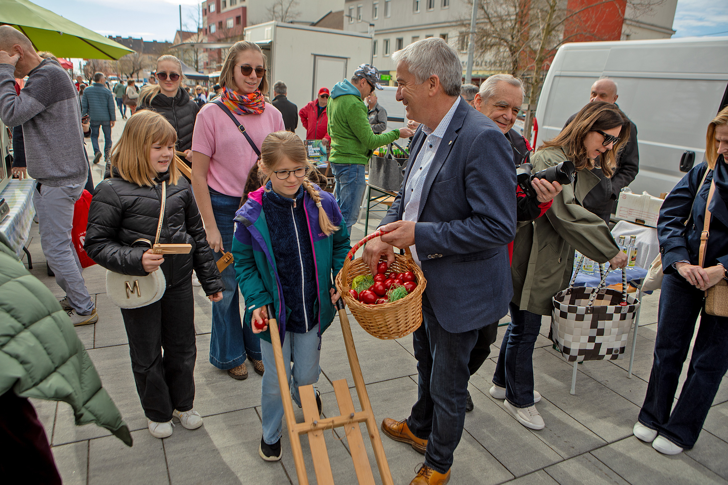 Bildtext Verteilung Ostereier in Oberwart_4: SPÖ Oberwart-Vizebürgermeister Michael Leitgeb mischte sich unter die Besucherinnen und Besucher.