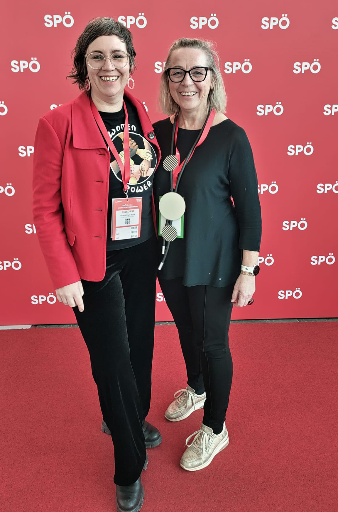 Bildtext SPÖ Frauen Bundeskonferenz_1: SPÖ Oberwart-Frauenvorsitzende Verena Liszt-Rohlf mit Christine Schober (v.l.) bei der SPÖ Frauen Bundeskonferenz in Wien.